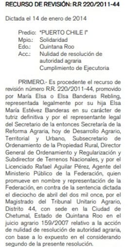 En 2007, cuando el problema estalló, en la Oficialía de Partes del Tribunal Unitario Agrario del Distrito Cuarenta y Cuatro, la parte afectada demandó del Secretario y otras autoridades de la Secretaría de la Reforma Agraria, así como del Procurador General de la República, del Registro Agrario Nacional, de los Delegados del Registro Público de la Propiedad y del Comercio en Cozumel y Playa del Carmen, de R. G. S. y otros, la nulidad