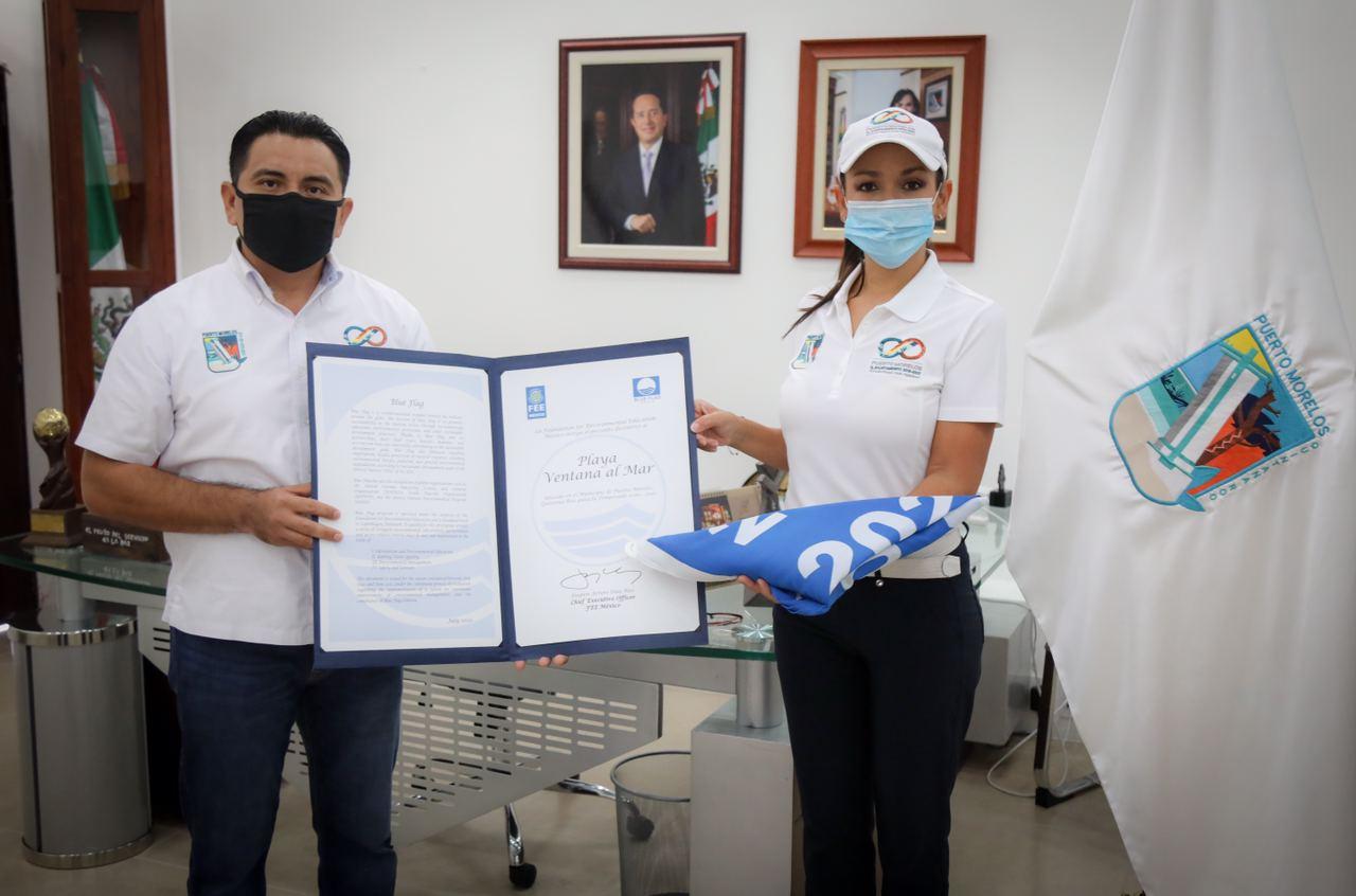 Puerto Morelos, Quintana Roo, 24 de agosto de 2020.- La presidenta municipal Laura Fernández Piña recibió el certificado y el estandarte “Blue Flag”, que por segundo año consecutivo ondeará en la Ventana al Mar y que reafirma el compromiso de Puerto Morelos de proteger el medio ambiente, al basar su desarrollo y crecimiento en apego a lineamientos de sostenibilidad.
