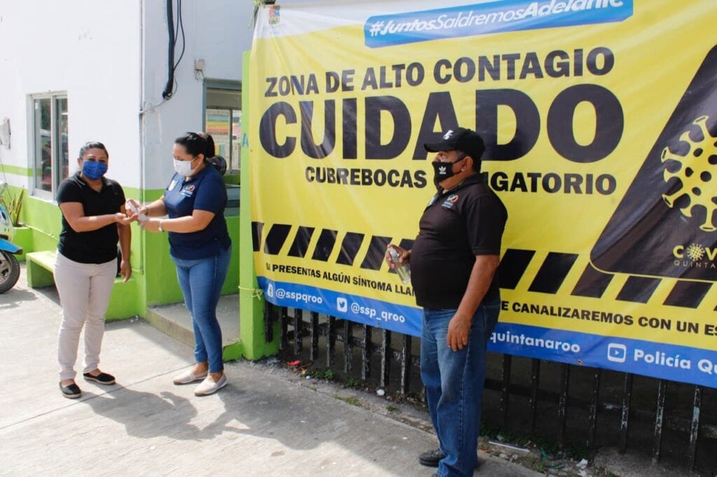 “En la comunidad de Leona Vicario ubicamos diferentes puntos a los que acude generalmente la ciudadanía, como son el edificio de la delegación, la Ventanilla Única y el paradero de las combis foráneas a Cancún y Puerto Morelos. Ahí, personal del ayuntamiento y del programa estatal ‘Guardianes por Quintana Roo’, también conocido como ‘Chalecos y Gorras Amarillas”, reparte gel antibacterial y cubrebocas, e invita a la gente a mantener la sana distancia. Cabe mencionar que previamente se colocaron lonas para alertar sobre el riesgo de contagio del nuevo coronavirus SARS CoV-2”, refirió.