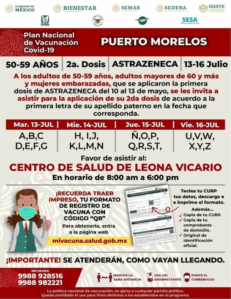 Puerto Morelos, Quintana Roo.- Este martes iniciará la aplicación de la segunda dosis de la vacuna AstraZeneca a personas de 50 a 59 años de edad de todo el municipio, informó la encargada de despacho de la Secretaría de Desarrollo Social, Juanita Chacón Canché, quien señaló que la inoculación tendrá lugar en el Centro de Salud de la comunidad de Leona Vicario.