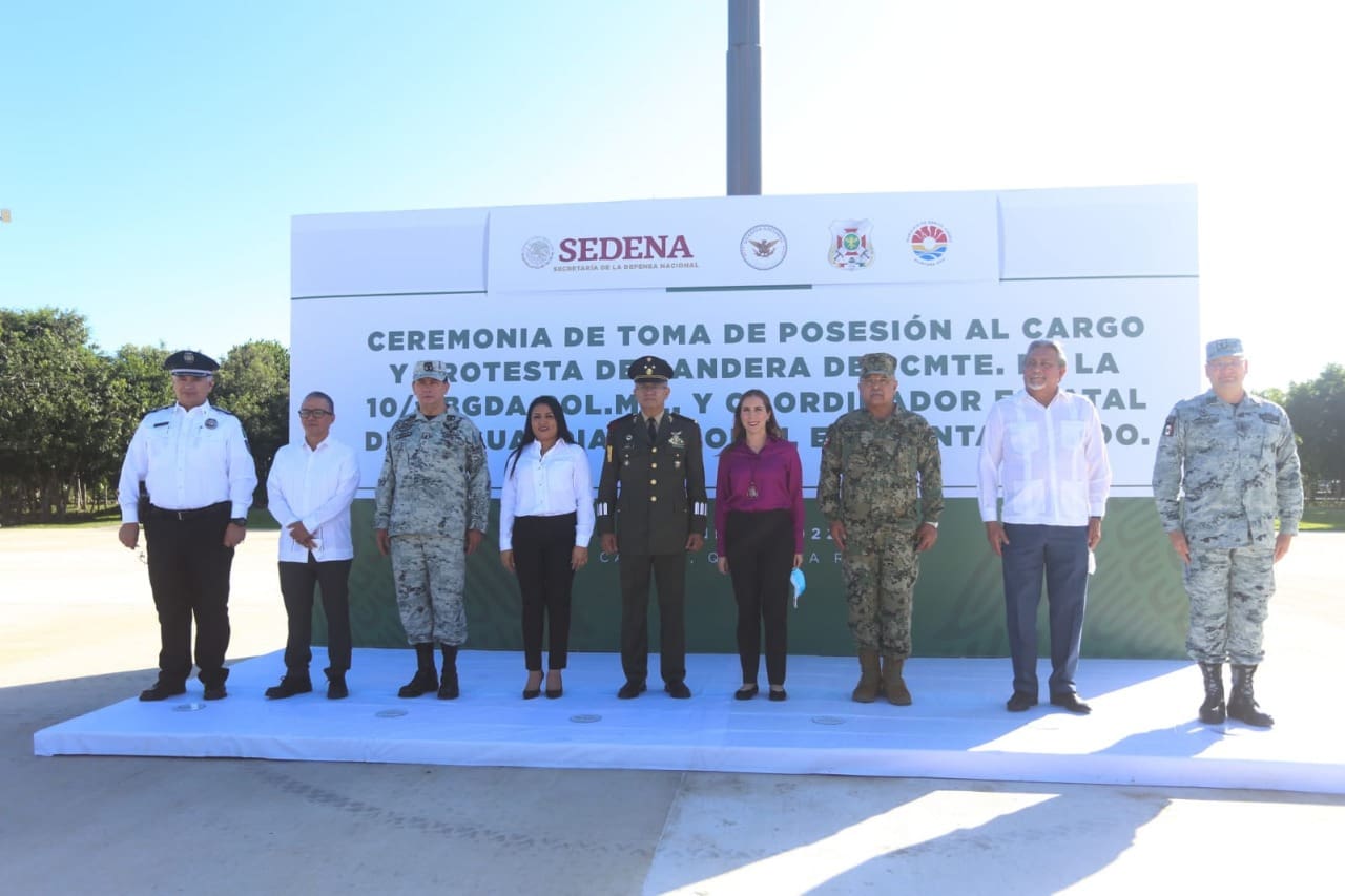 Cancún, Quintana Roo, 4 de enero de 2022.- La presidenta municipal de Puerto Morelos, Blanca Merari Tziu Muñoz, asistió hoy a la ceremonia de Toma de Posesión y Protesta de Bandera del general brigadier Diplomado de Estado Mayor (DEM) Alberto Román González Fernández, como Comandante de la Décima Brigada de la Policía Militar y Coordinador de la Guardia Nacional en Quintana Roo, en sustitución del comisario Francisco Justo Toscano.