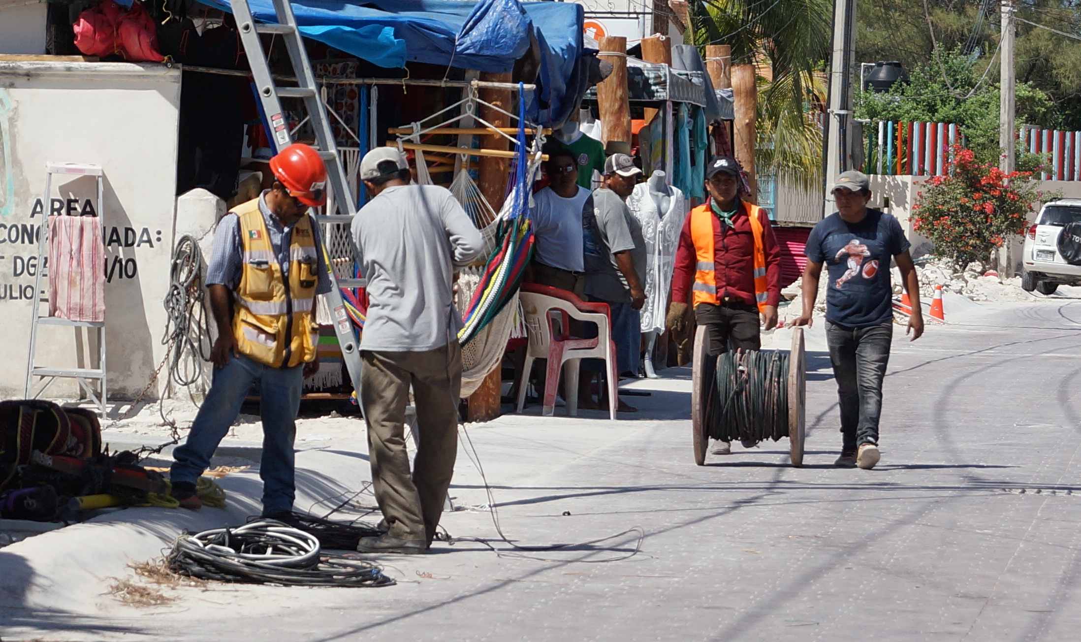 Puerto Morelos.- La transformación de la imagen del Casco Antiguo de Puerto Morelos continúa a paso firme, al iniciar el retiro del cableado aéreo de la Comisión Federal de Electricidad (CFE) y la conexión de los negocios al suministro subterráneo en el primer cuadro de la zona.