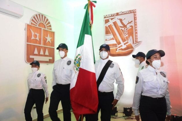 Abajo, alrededor de 70 héroes de Puerto Morelos, entre ellos policías, bomberos, trabajadores de los dispensarios médicos, de Protección Civil, de Servicios Generales que se encargan de la sanitización de comercios, áreas públicas y unidades de transporte, de Desarrollo Social que en largas jornadas entregaron casa por casa despensas a las familias de todo el municipio, y fiscales, replicaron los nombres de quienes dieron a esta nación patria y libertad.