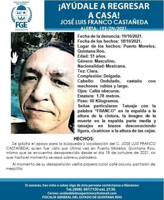 Puerto Morelos, Quintana Roo.-Un padre de familia comprometido, carpinero por oficio y cineasta de profesión es buscado por su familia, pues desde el 18 de octubre, José Luis Franco Castañeda, de 51 años de edad, salió de compras al Chedraui de la carretera Federal, sin que hasta el momento se sepa nada de él.