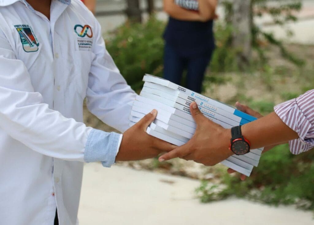 Puerto Morelos.- En este arranque del ciclo escolar 2021-2022 nos preparamos con esta nueva normalidad que vivimos a causa de la pandemia de Covid-19, esperando que paulatinamente logremos volver a las aulas, que es una de las metas que queremos alcanzar para poder brindar la mejor atención académica a los estudiantes de Puerto Morelos, indicó el secretario municipal de Desarrollo Humano, Juan López Toox, durante la entrega de libros de texto gratuito a secundarias de la comunidad.