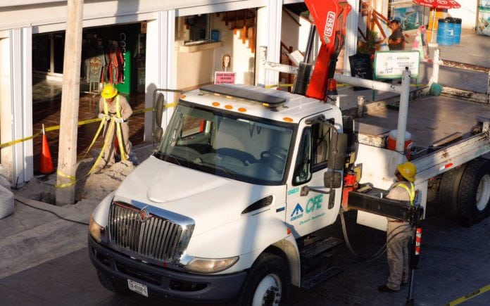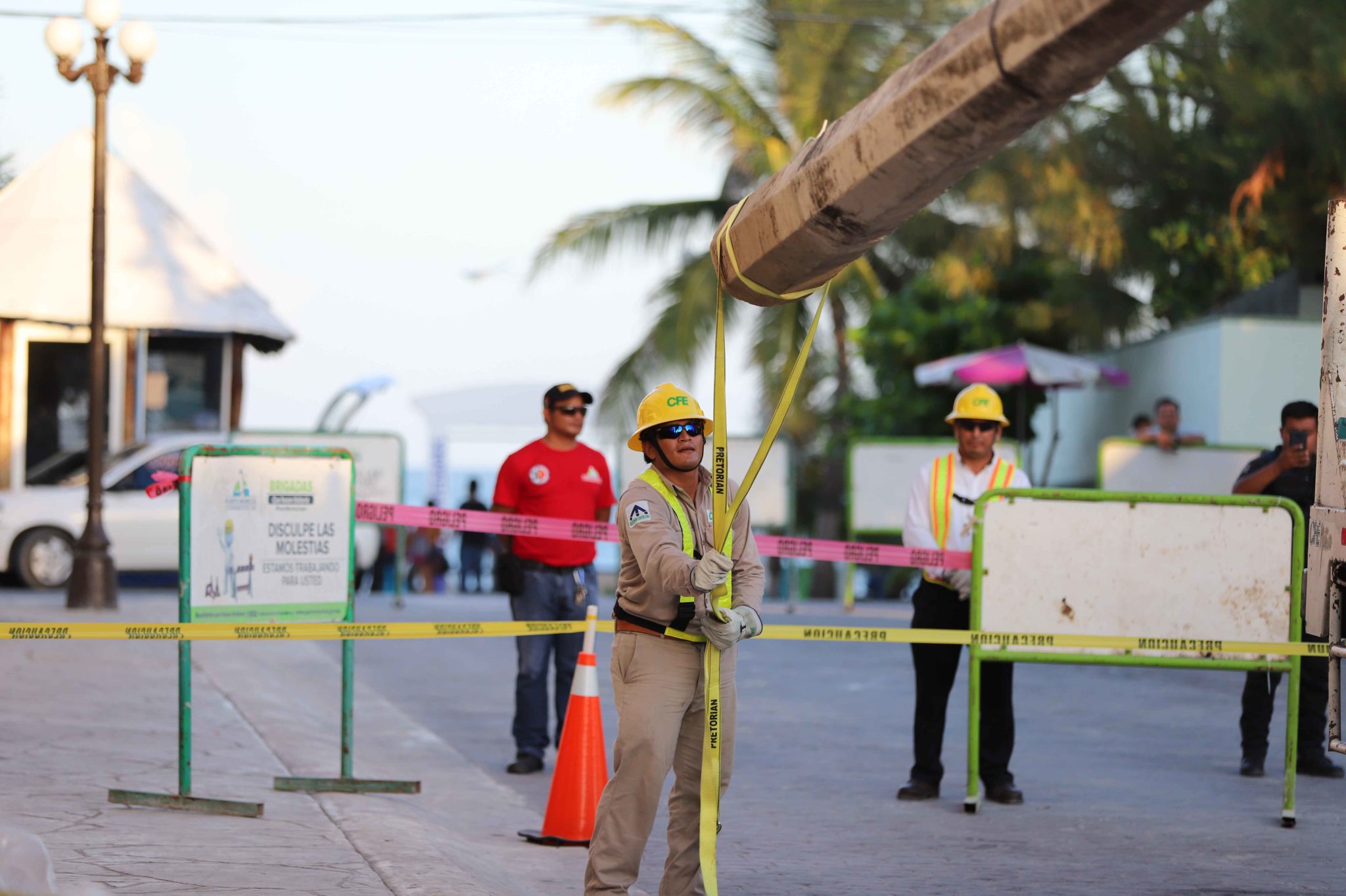 Puerto Morelos.- En un día histórico para Puerto Morelos, y como parte de los trabajos de embellecimiento y modernización del Casco Antiguo, la presidenta municipal Laura Fernández Piña atestiguó esta tarde las maniobras para el retiro de los dos primeros postes de la Comisión Federal de Electricidad (CFE) y Teléfonos de México (Telmex).