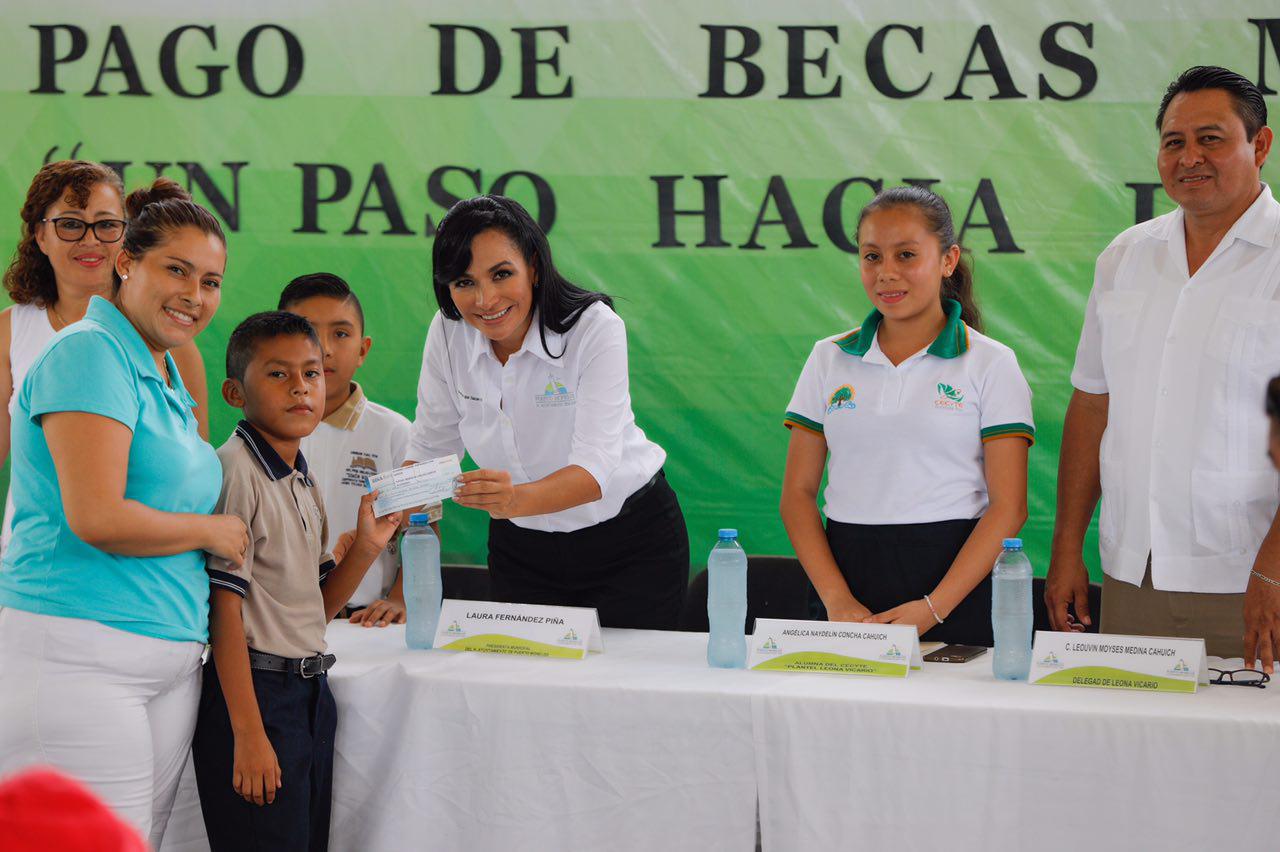 Leona Vicario, Puerto Morelos.- En cumplimiento al compromiso con la educación y un apoyo a la economía de las familias portomorelenses, la presidenta municipal Laura Fernández Piña entregó hoy becas a estudiantes de primaria y secundaria de esta delegación municipal, correspondientes al periodo enero a junio de 2018.