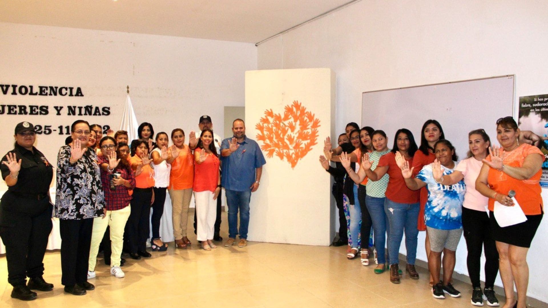 Ahí, pegaron manos de cartón color naranja en una mampara, para visibilizar las agresiones que aún siguen sufriendo mujeres y niñas, y así generar conciencia sobre este problema social.