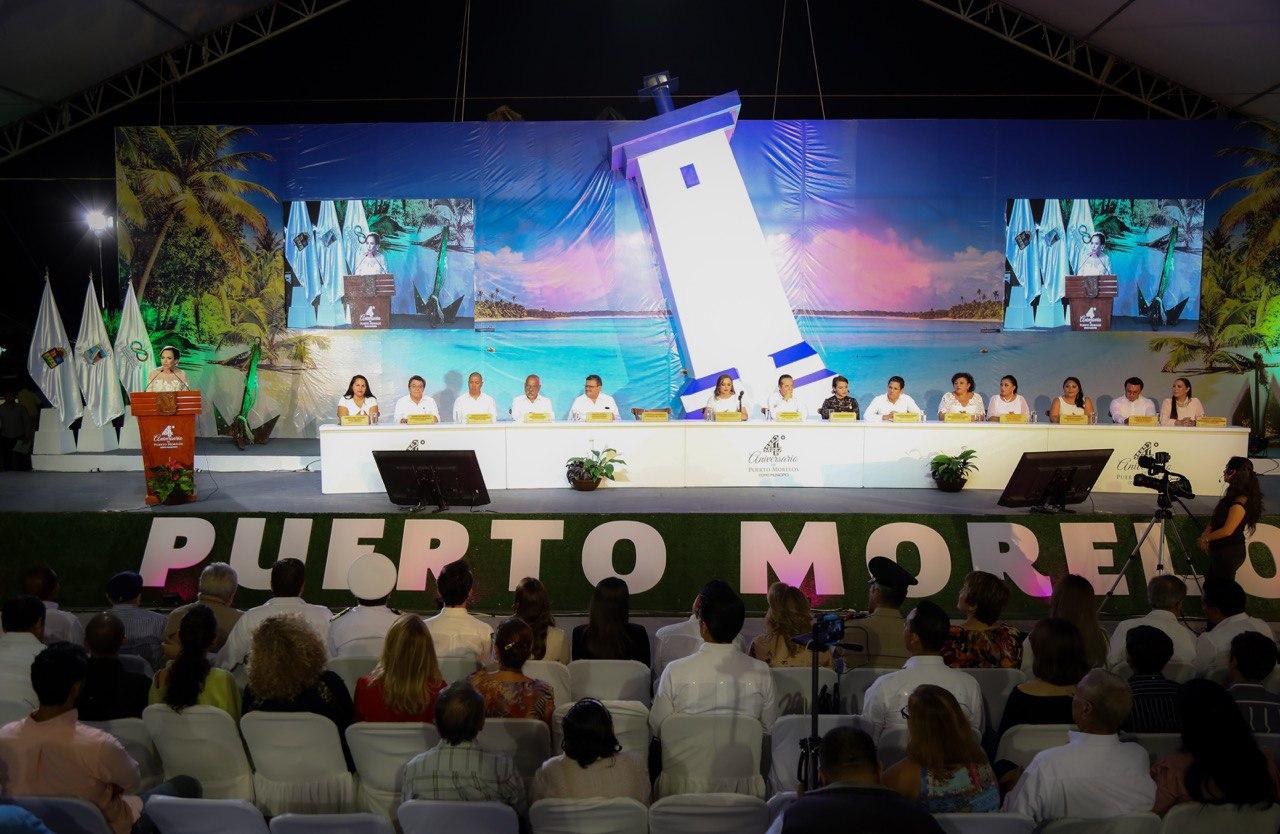 Puerto Morelos.- Puerto Morelos cumple cuatro años de vida como municipio con la fuerza de una unidad que se forja en el consenso, articulando propósitos y conjugando todas las voces, destacó la alcaldesa Laura Fernández Piña durante la IV Sesión Solemne de Cabildo, que tuvo lugar esta noche en el parque principal del Casco Antiguo, con la presencia del gobernador Carlos Joaquín González.