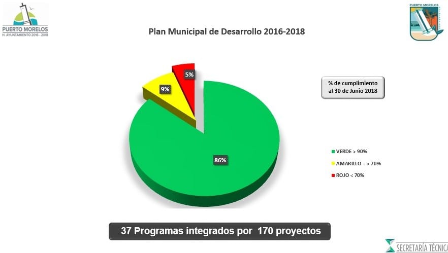 Puerto Morelos, Quintana Roo.- El gobierno de Puerto Morelos cumplirá en el último trimestre de la administración, prácticamente con el 100 por ciento de los 37 programas, integrados por 170 proyectos, establecidos en el Plan Municipal de Desarrollo 2016-2018.