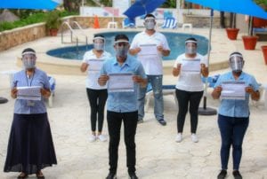 Puerto Morelos, Quintana Roo, 2 de julio de 2020.- La presidenta municipal Laura Fernández Piña formuló un reconocimiento a los pequeños hoteles de Puerto Morelos, que ya reabrieron sus puertas para recibir vacacionistas en la nueva normalidad, en la que han adoptado estrictos protocolos sanitarios para proteger del Covid-19 a sus plantillas de trabajadores y a los turistas.