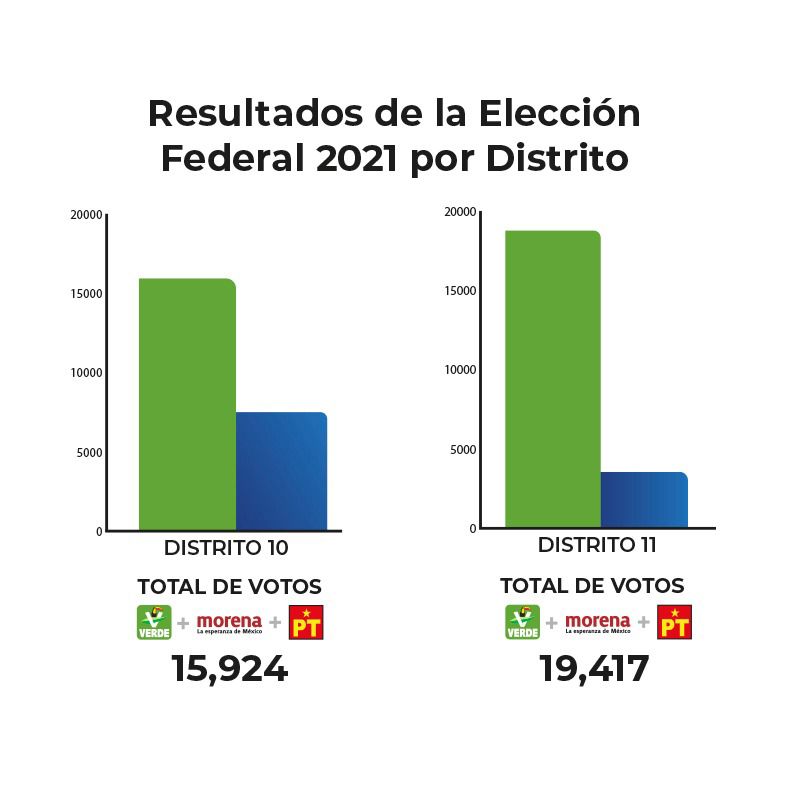 • En la pasada elección federal de 2021, en lo que respecta a la demarcación correspondiente al Distrito 10, la coalición obtuvo 15 mil 924 votos, contra 7 mil 498 de la alianza opositora; y en lo que sería el Distrito 11 local, lograron 19 mil 417 votos contra 3 mil 668 votos