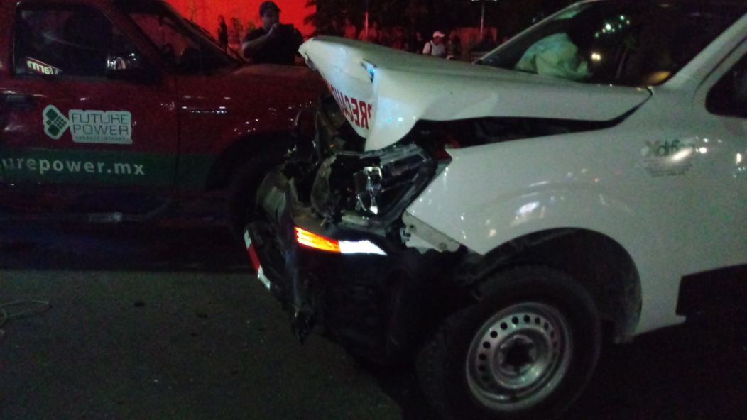 Mientras circulaban sobre la avenida Pavorreal con avenida Sur del fraccionamiento Villas del Sol, se impactaron de frente con otro vehículo dejando la unidad en pedazos, además de los daños materiales que se calcula en más de 60 mil pesos.