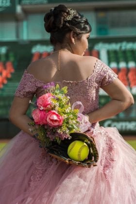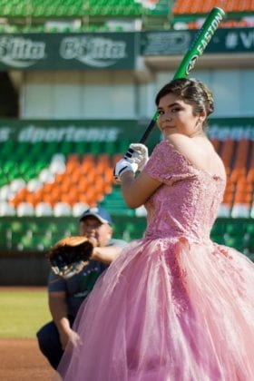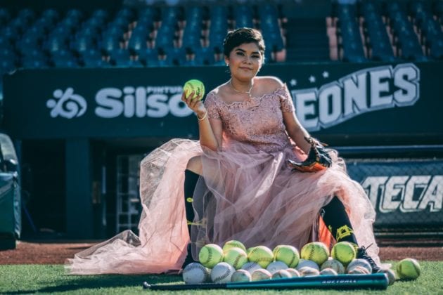 En la sesión de fotos se puede ver a Gilian posando con su vestido rosa picheando y bateando con spikes y calcetas beisboleras, pues de las cosas que más disfruta es del beisbol.