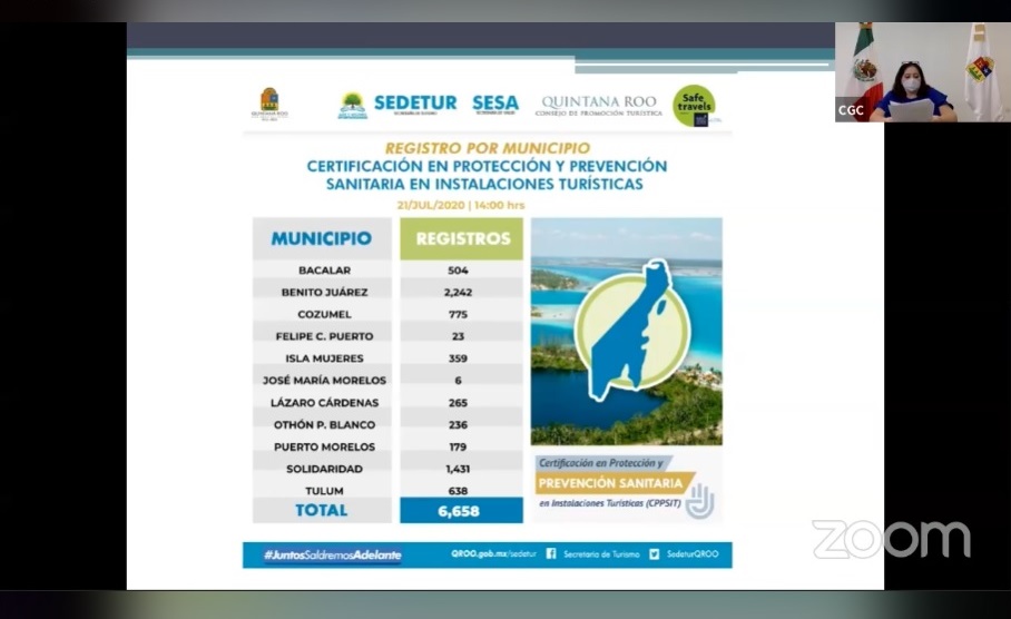 Se trabaja con todos los municipios para llevar a cabo durante el aislamiento de las personas en su domicilio, capacitaciones y certificaciones para que se preparen al momento de la apertura cuando se tenga ya funcional. Y la certificación de prevención sanitaria en instalaciones turística, junto con la Secretaría de Salud (Sesa) y Sedetur.