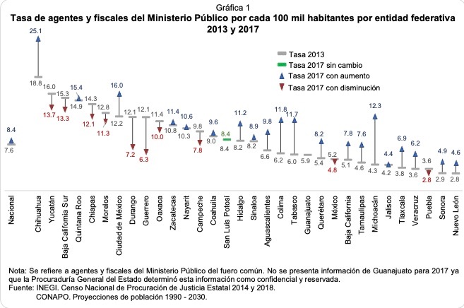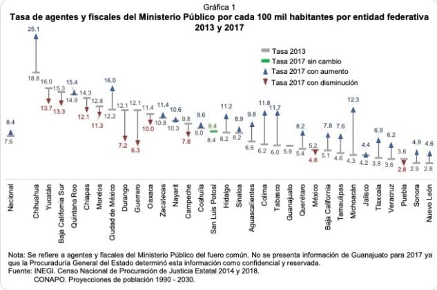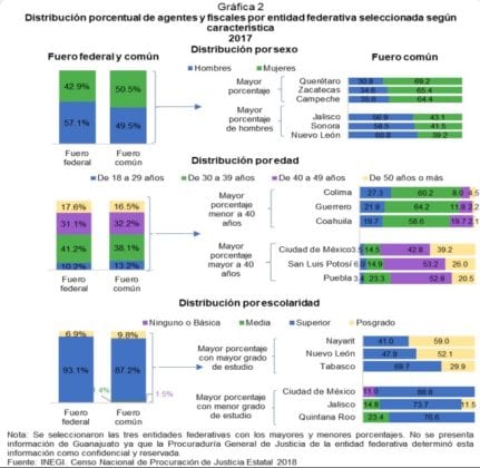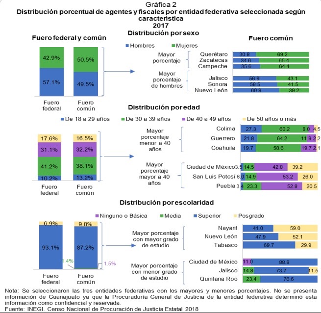 Estas cifras corresponden al 2017, donde a nivel país se tenían entonces 3 mil 462 agencias y 10 mil 315 agentes y fiscales del fuero común, mientras que había 195 agencias y 2 mil 940 agentes y fiscales para los delitos del fuero federal.