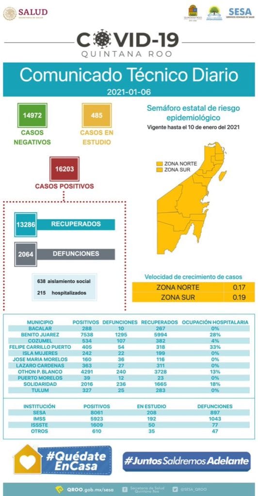 Autoridades sanitarias informaron que en Quintana Roo se han notificado hasta hoy 6 de enero de 2021, 2 mil 64 defunciones y 16 mil 203 casos positivos de Covid-19.