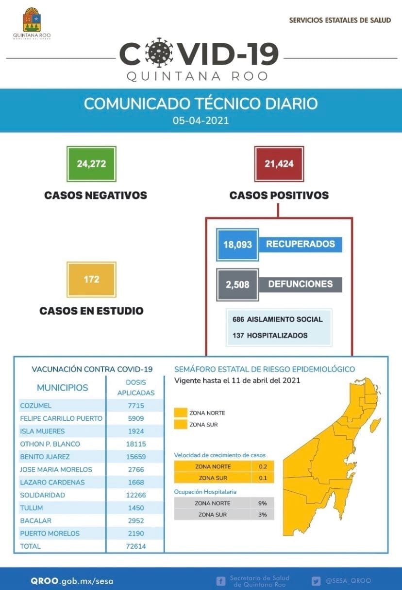 Chetumal.- Quintana Roo arrancó la semana con la reactivación de sus jornadas de  vacunación COVID-19, el reporte de 18 nuevos casos positivos, y por segundo día consecutivo, cero decesos.
