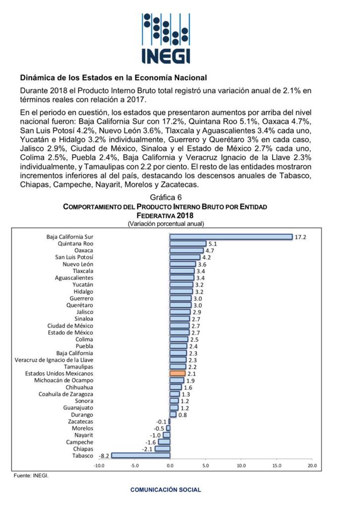 Los estados que reportaron el mayor crecimiento anual en su PIB en términos reales fueron Baja California Sur con una tasa de 17.2%, Quintana Roo 5.1%, Oaxaca 4.7%, San Luis Potosí 4.2%, Nuevo León 3.6%, Tlaxcala y Aguascalientes con 3.4% en cada entidad, Yucatán e Hidalgo 3.2% cada uno, Guerrero y Querétaro 3% en cada caso. Todas las tasas son comparativas con relación al 2017.