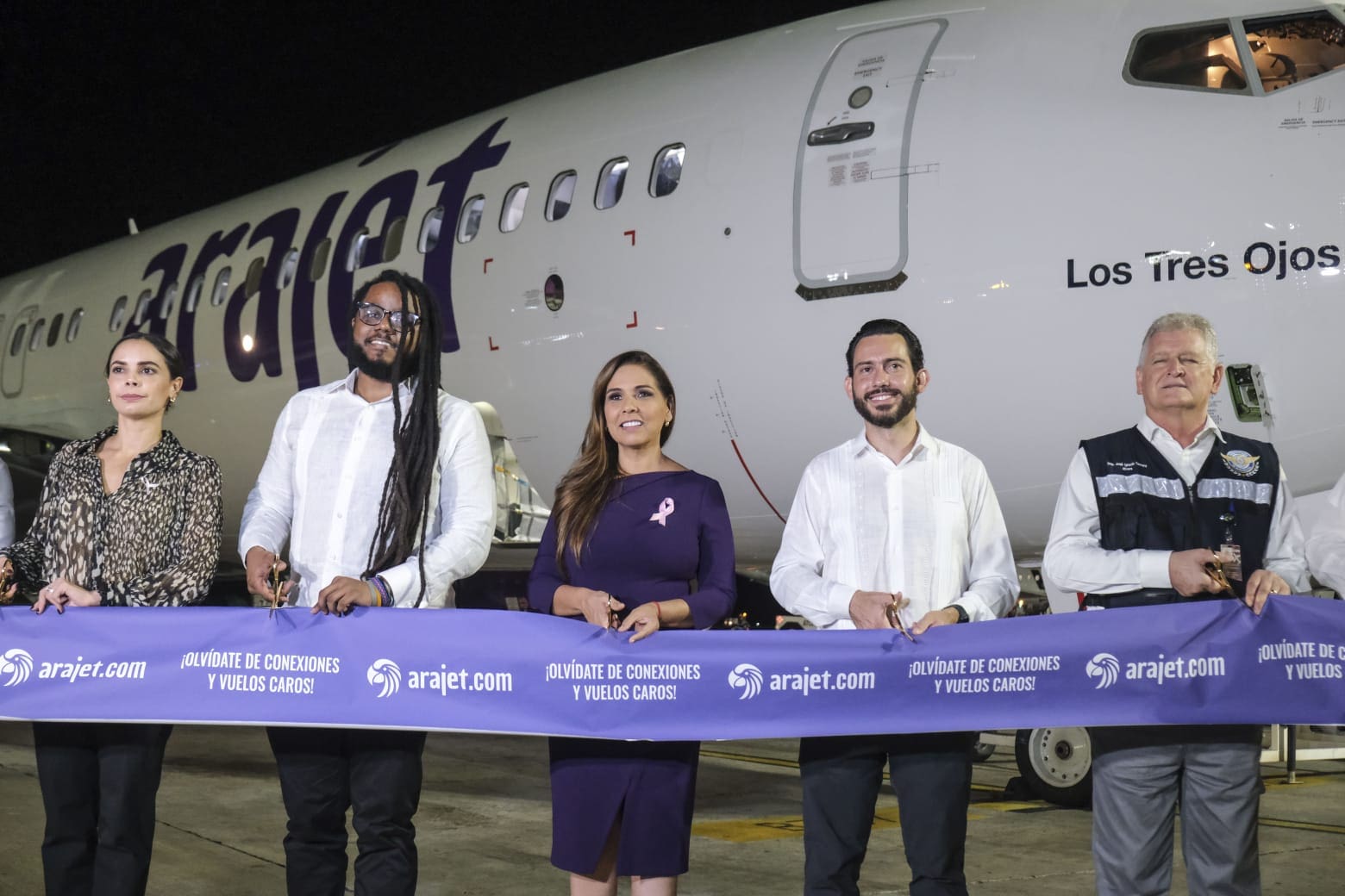 Cancún.- La confianza que el mundo tiene en el Estado, se refleja en las visitas que continúa recibiendo de turistas nacionales e internacionales, destacó la gobernadora, Mara Lezama, durante la inauguración del vuelo Arajet de Santo Domingo, República Dominicana – Cancún.