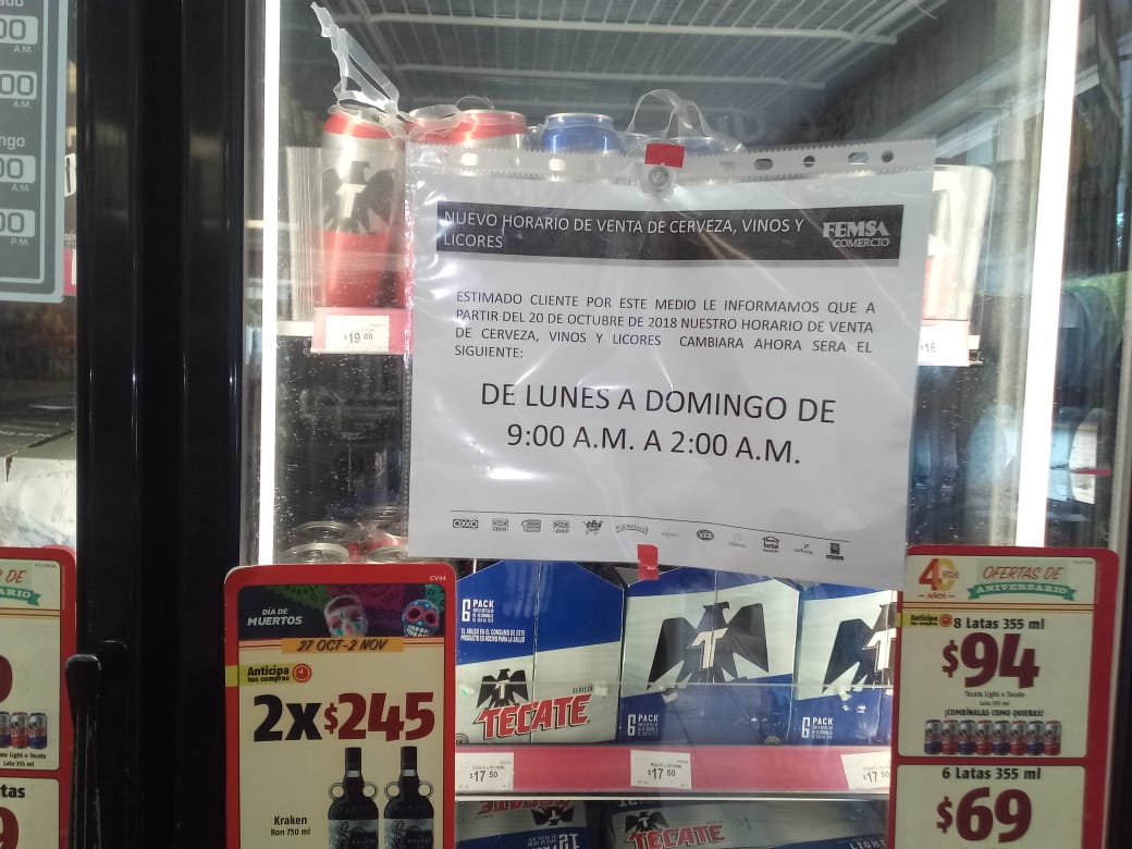 Los anuncios con el nuevo horario fueron colocados en los refrigeradores donde se vende alcohol, sin dar explicación sobre el cambio.
