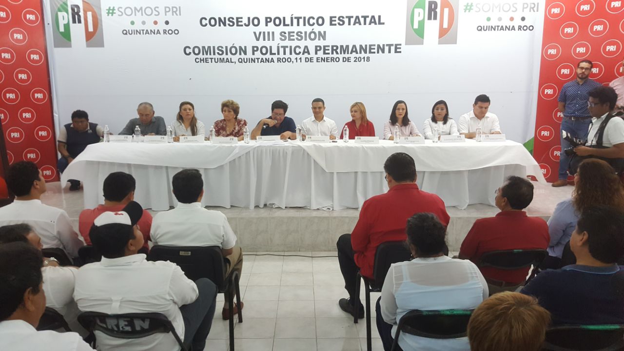 Chetumal.- El Consejo Político Estatal del Partido Revolucionario Institucional (PRI), a través de la Comisión Política Permanente, realizó una sesión esta tarde para autorizar una comisión de alianza, para entrar en diálogo con el Partido Verde y Nueva Alianza, además de avalar la emisión de la convocatoria para las precandidaturas a las presidencias municipales.