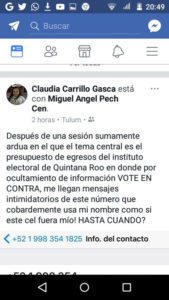 Cerca de una hora después, Claudia Carrillo Gasca publicó en su cuenta de Facebook el siguiente mensaje: “Después de una sesión sumamente ardua en el que el tema central es el presupuesto de egresos del instituto electoral de Quintana Roo, en donde por ocultamiento de información VOTE EN CONTRA, me llegan mensajes intimidatorios de este número que cobardemente usa mi nombre como si este cel fuera mío! HASTA CUANDO?” (sic).