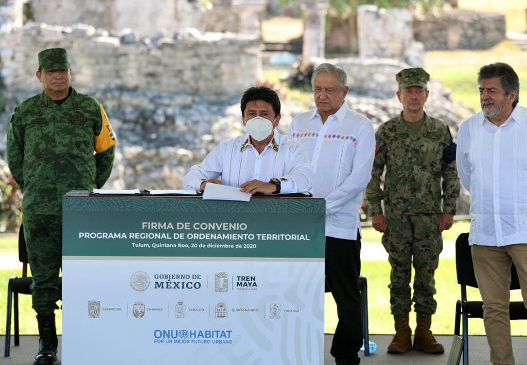 Tulum, Quintana Roo.- “El Tren Maya y el nuevo aeropuerto, serán un detonante del desarrollo económico, turístico, social y cultural de Tulum y sus habitantes”, afirmó el presidente municipal de Tulum, Víctor Mas Tah, tras firmar el convenio de Ordenamiento Territorial del Tren Maya, encabezado por el Presidente de la República, Andrés Manuel López Obrador, que pone a Tulum en el camino de las inversiones públicas y privadas que contribuirán en la generación de empleos y el bienestar de los tulumenenses.