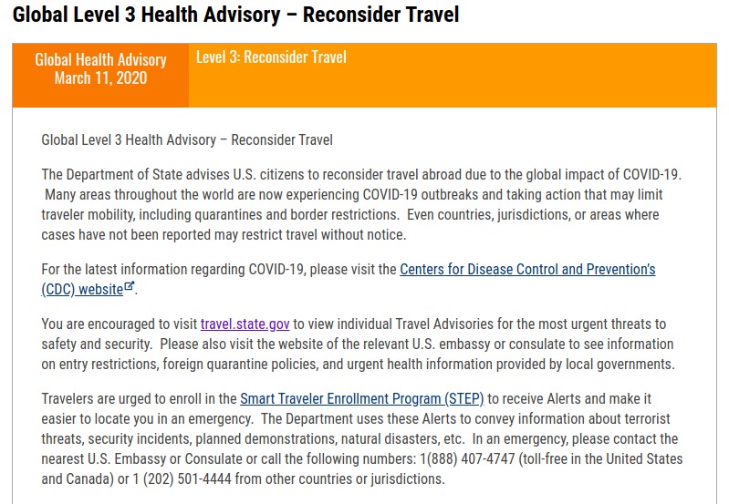 La recomendación de salud del gobierno estadounidense señala: “El Departamento de Estado recomienda a sus ciudadanos reconsideren viajar al extranjero, por el impacto global del COVID-19. Muchas áreas alrededor del mundo ahora experimentan brotes de COVID-19 y toman acción que pueden limitar la movilidad, incluyendo restricciones fronterizas o cuarentenas. Incluso países, jurisdicciones o áreas en donde no se han reportado casos pueden restringir el viaje sin aviso previo”.