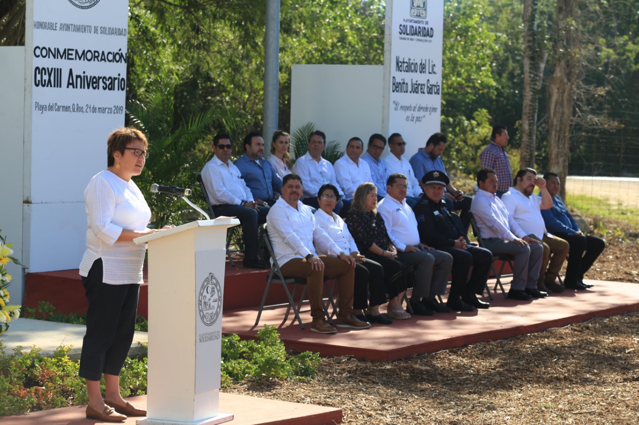 Solidaridad.- Durante el 213 Anivesario del natalicio de Benito Juárez, la presidenta municipal, Laura Beristain Navarrete, hizo un llamado a la sociedad para “no dejarse llevar por impulsos mal sanos de violencia”. Asimismo anunció que próximamente lanzará una campaña de desarme.