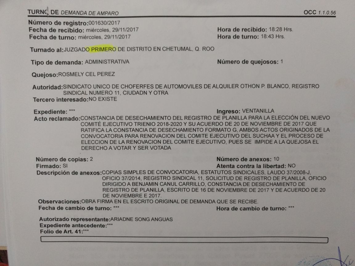 Chetumal.- Rosemely Cel Pérez, aspirante a la secretaría general del Sindicato Único de Choferes de Automóviles de Alquiler (Suchaa), que fue descartada de la contienda, presentó una solicitud de amparo ante un juez federal, para que se le permita concursar.