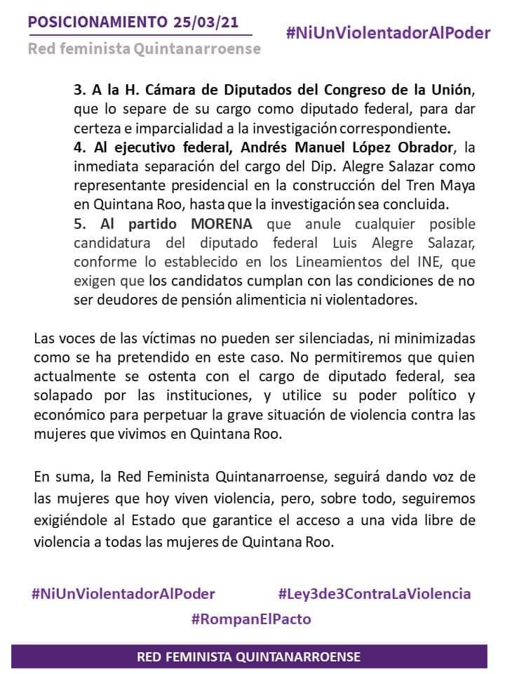También piden al partido Morena anular cualquier posible candidatura del diputado federal Luis Alegre Salazar conforme lo establecen los lineamientos del INE en el que se exige que los candidatos cumplan con las condiciones de no ser deudores de pensión alimenticia ni violentadores.