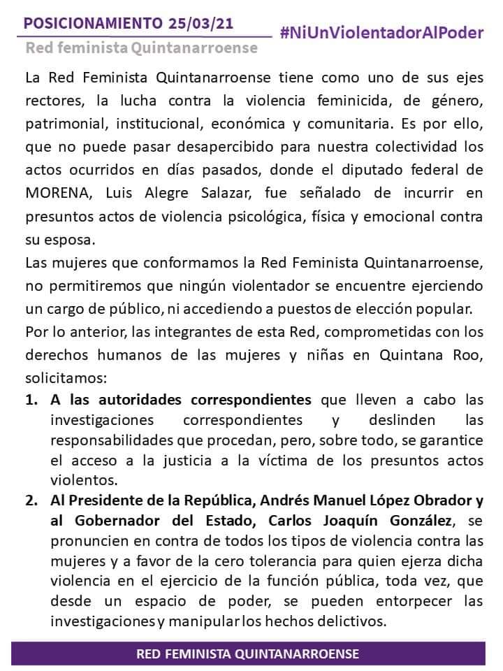 Chetumal.- La Red Feminista Quintanarroense pidió que el diputado federal de Morena, Luis Alegre Salazar sea separado de su cargo, debido a que el diputado está vinculado a una investigación por violencia familiar contra su esposa.