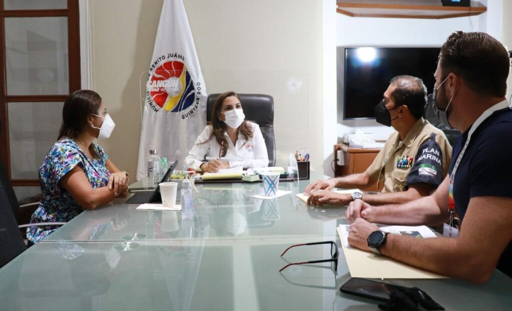 La Presidenta Municipal dialogó con el coordinador de la Estrategia Nacional Antisargazo, Contralmirante C. G. D. E. M. Alejandro López Zenteno; la coordinadora de Vinculación y Enlace de la oficina del Ejecutivo Estatal, Mariana García Pérez; y el director de la Zona Federal Marítimo Terrestre (Zofemat) de Benito Juárez, Vagner Elbiorn Vega.