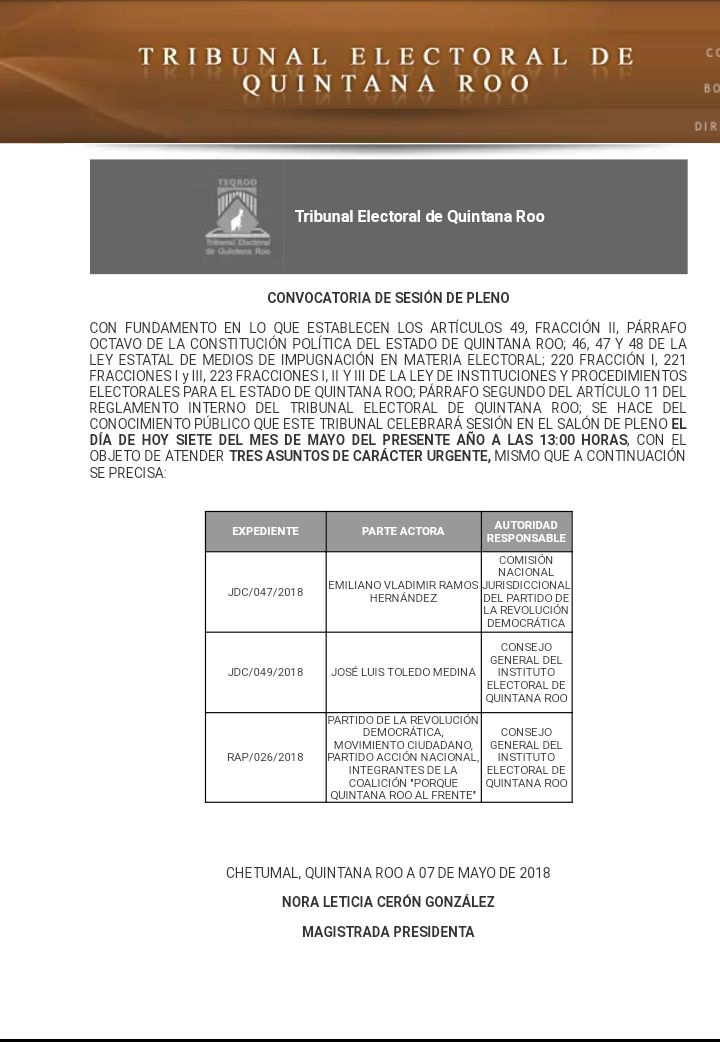 El pleno del Tribunal Electoral de Quintana Roo (Teqroo), sesionó la tarde de este lunes, y resolvió confirmar el acuerdo del 20 de abril del Consejo General del Instituto Electoral de Quintana Roo (Ieqroo), mediante el cual, los consejeros electorales decidieron negar el registro de Toledo Medina, lo cual, fue ratificado este día por los magistrados electorales.