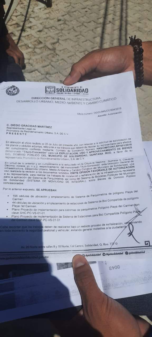 En esta ocasión, personal de esta empresa, con razón social “Promotora de Reordenamiento Urbano S.A. de C.V.” trajo consigo un permiso del Ayuntamiento de Solidaridad, con la aprobación para la instalación del sistema de parquímetros y de bicicletas compartidas.