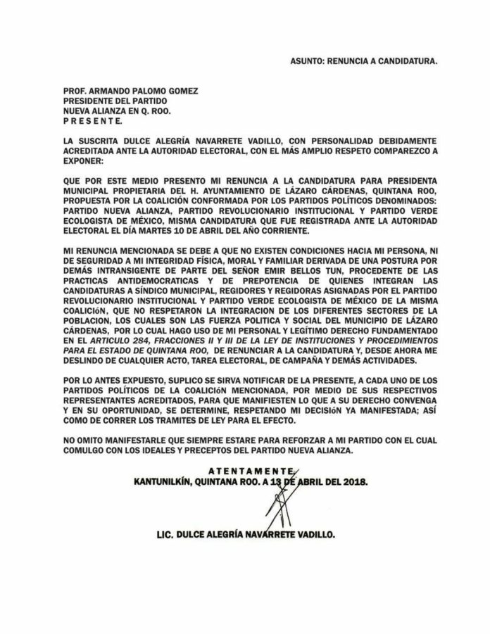 Kantunilkin.- Dulce María Navarrete Vadillo presentó su renuncia como candidata del Partido Nueva Alianza para la presidencia municipal de Lázaro Cárdenas.