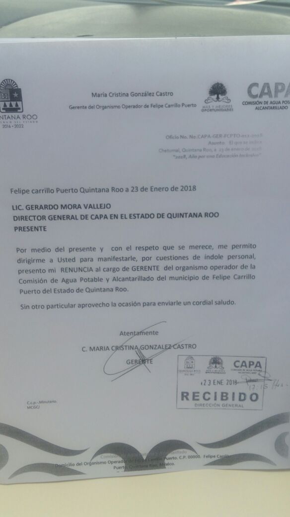 Felipe Carrillo Puerto.- Cristina González Castro, gerente de la Comisión de Agua Potable y Alcantarillado (CAPA) en el municipio renunció a su cargo, para buscar la candidatura a la presidencia municipal de Felipe Carrillo Puerto, por el Partido de la Revolución Democrática (PRD).