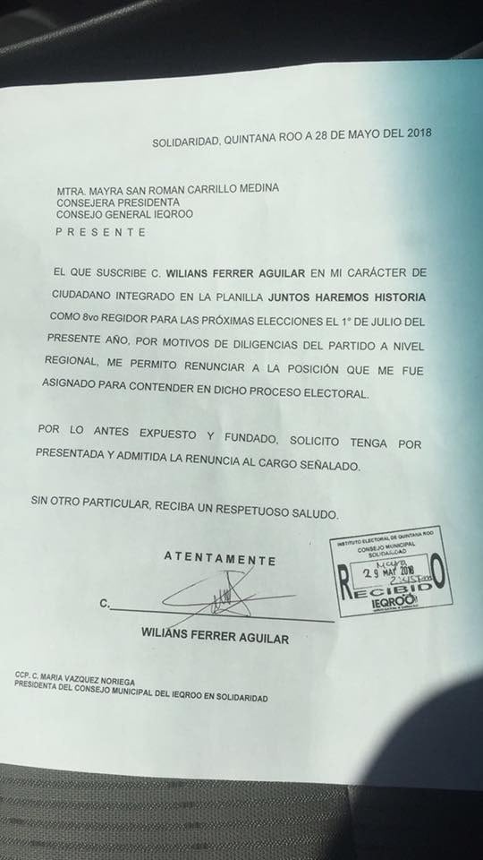 La renuncia fue presentada ante Mayra San Román Carrillo Medina, Consejera Presidenta del Consejo General del Instituto Electoral de Quintana Roo (IEQROO), debido a “diligencias del partido a nivel regional”.