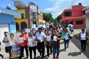 Acto seguido, y con lonas con la imagen de su candidata, caminaron a la casa de campaña de Sofía Alcocer para “sumarse a su campaña”.