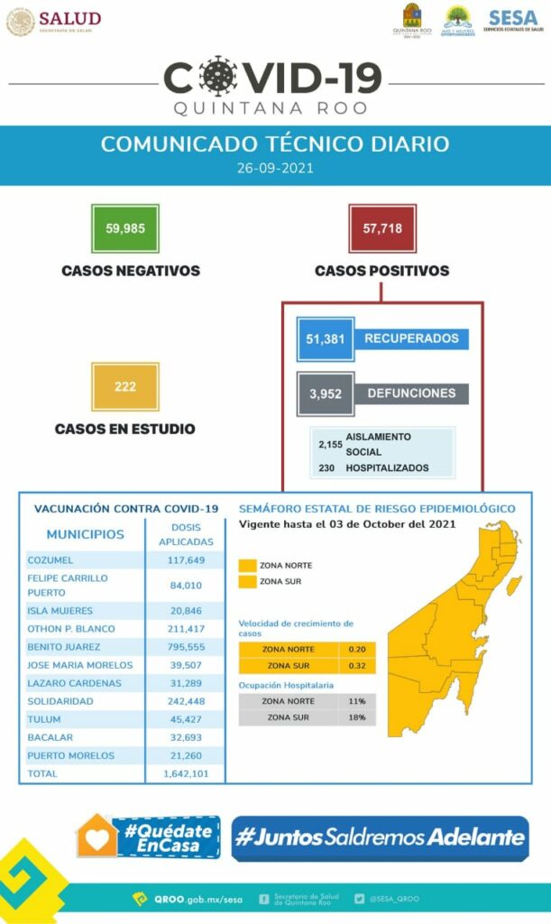 En el informe técnico del organismo de salud encabezado por la doctora Alejandra Aguirre Crespo, indica que hasta este 26 de septiembre de 2021, suman en Quintana Roo 57 mil 718 casos de coronavirus y han fallecido por esta enfermedad 3 mil 952 personas.