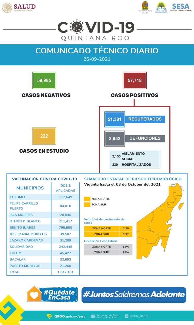 En el informe técnico del organismo de salud encabezado por la doctora Alejandra Aguirre Crespo, indica que hasta este 26 de septiembre de 2021, suman en Quintana Roo 57 mil 718 casos de coronavirus y han fallecido por esta enfermedad 3 mil 952 personas.