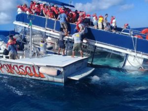 Cozumel.- Una embarcación turística tipo catamarán con 95 pasajeros alemanes y un bebé se hundió parcialmente después de quedar a la deriva y ser arrastrado por el fuerte oleaje, en la zona norte de la isla.