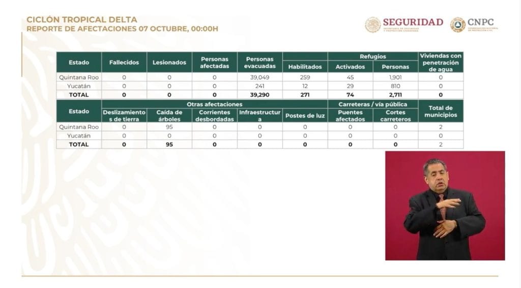 Hasta las 7 de la mañana, se tenía un saldo blanco por el paso del Huracán Delta por la Península de Yucatán, en donde se evacuaron a 39 mil personas, según se informó en la conferencia mañanera del presidente de la República, Andrés Manuel López Obrador.