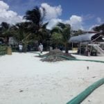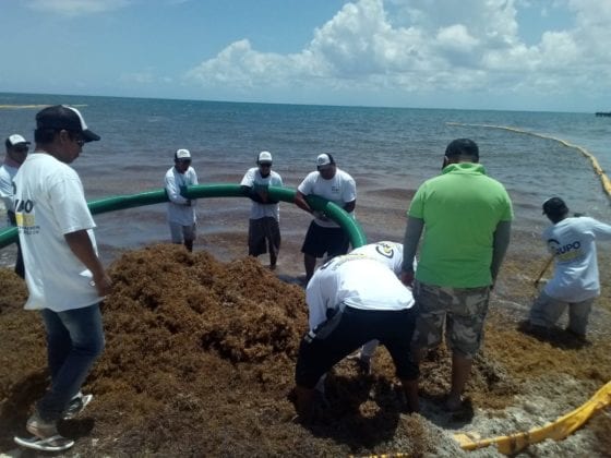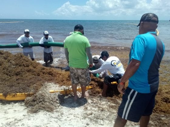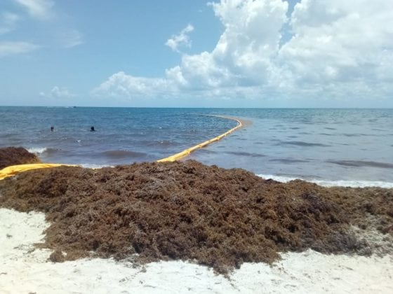 Playa del Carmen.- Desde ayer, grandes cantidades de sargazo han recalado en las playas de esta ciudad, pese a la instalación de una barrera antisargazo, aún en prueba piloto.