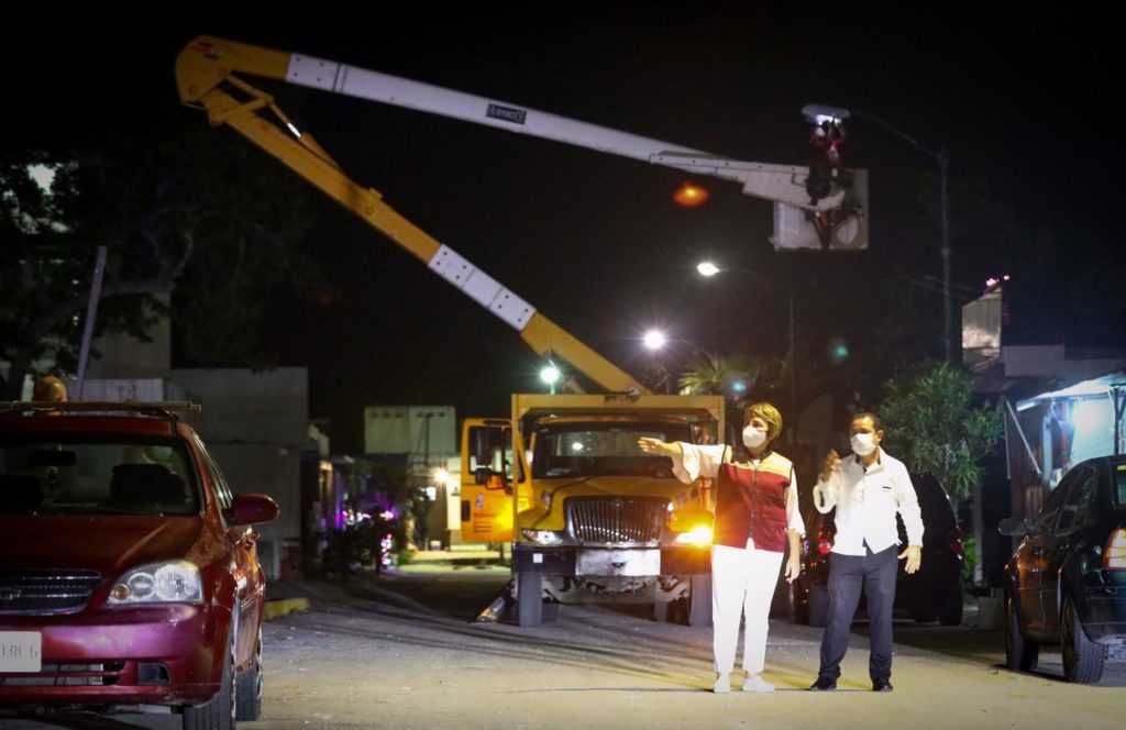 Playa del Carmen, Solidaridad, a 15 de diciembre del 2020.- La presidenta municipal de Solidaridad, Laura Beristain Navarrete, supervisó el trabajo que personal de la Secretaría de Servicios Públicos Municipales realiza a marchas forzadas en diversos puntos de la ciudad para dar mantenimiento a luminarias en todo el municipio.