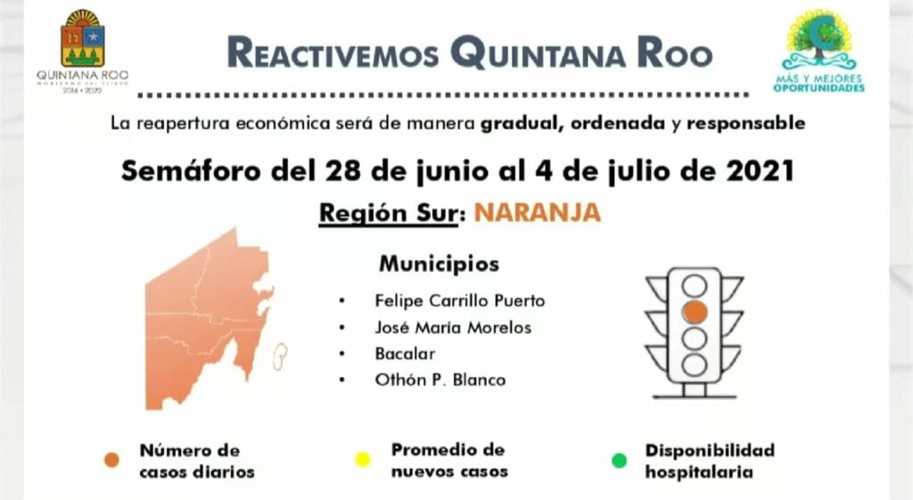 Región Sur se mantiene en color naranja, municipios Felipe Carrillo Puerto, José María Morelos, Bacalar y Othón P Blanco.