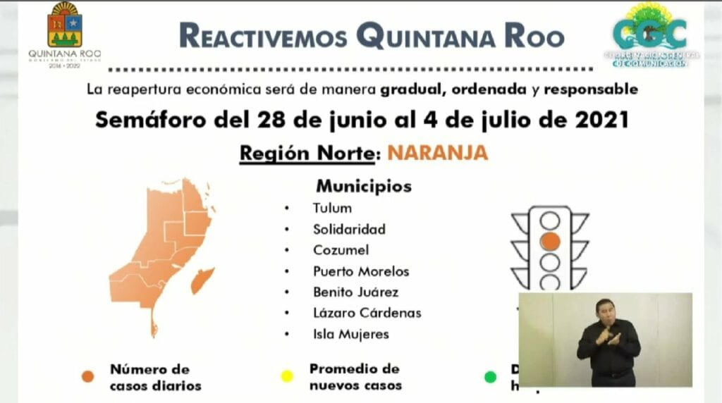 Región Norte, perteneciente a los munr de Tulum, Solidaridad, Cozumel, Puerto Morelos, Benito Juárez, Lázaro Cárdenas e Isla mujeres se mantiene en color naranja.