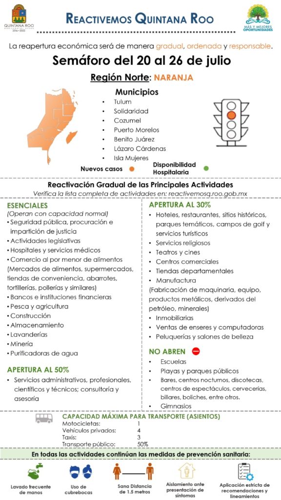 Por su parte, en los municipios de la zona norte (Isla Mujeres, Lázaro Cárdenas, Benito Juárez, Puerto Morelos, Solidaridad, Cozumel y Tulum), la capacidad hospitalaria está en “verde” y los nuevos casos de COVID se consideran en “naranja”, por lo que el nivel de alerta seguirá en “naranja”, con una apertura de un 30% en la mayoría de los giros comerciales.