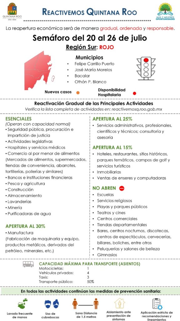 Chetumal.- La zona sur de Quintana Roo pasará otra semana, del 20 al 26 de julio, con el semáforo epidemiológica en nivel “rojo”, el máximo nivel restrictivo; mientras que la zona norte seguirá en nivel naranja, con la mayoría de sus actividades con una capacidad máxima de un 30%.